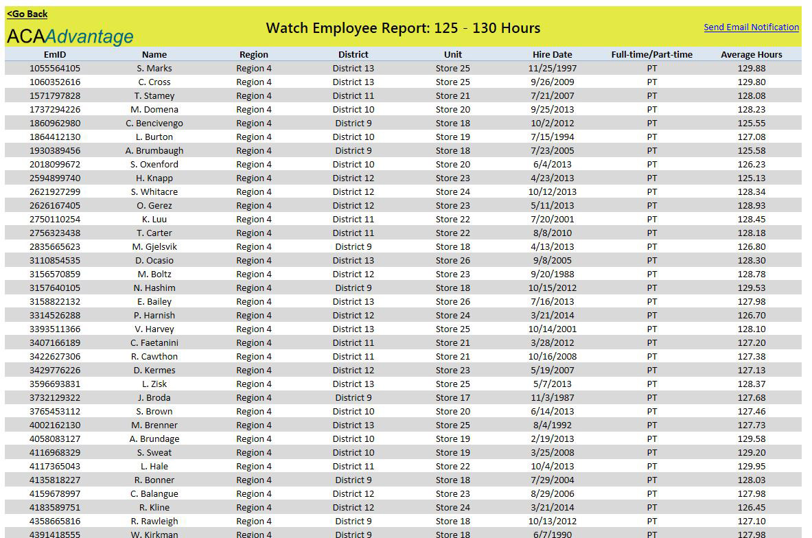 You can monitor actual hours worked by variable hour employees during the applicable measurement period and identify employees approaching the 130 hour per month threshold as well as those who exceeding the 130 hour threshold.